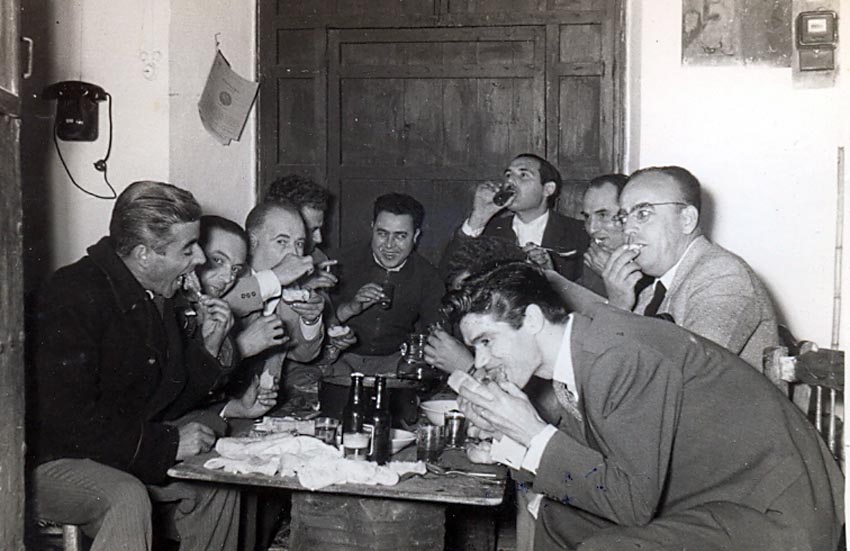 En la fotografía de la comida (cedida por Francisco Godoy, “Pin”, sobrino de Manolo el latero) aparecen Miguel Santos (mi suegro), Juan José el zapatero, asomando a su lado, otros comensales, Manolo, el tabernero, en medio (bebiendo), y a su derecha, Agustín. Seguidamente a ellos, Salvador Caamaño y Almenara.